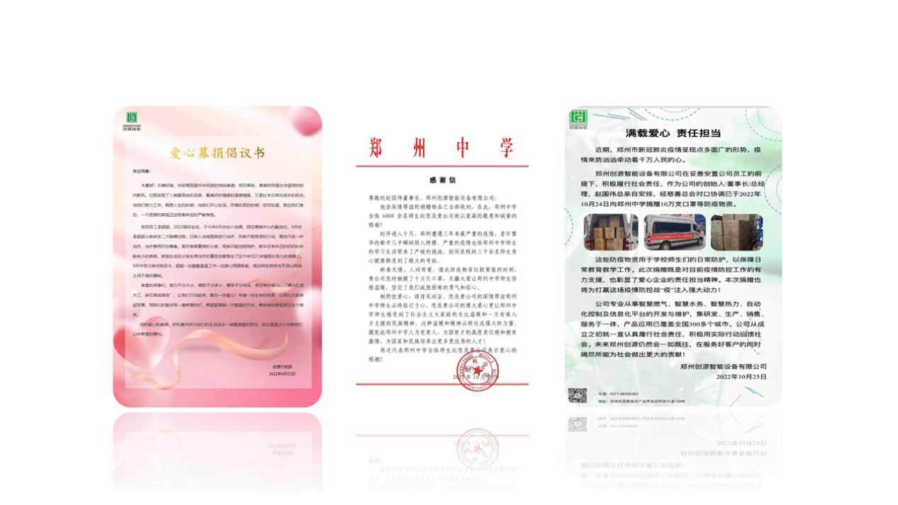 2010年公司成立之初,即向革命老區(qū)---河北省西柏坡華潤集團(tuán)承建的紅色希望小鎮(zhèn)捐贈(zèng)無線遠(yuǎn)傳智能燃?xì)獗砑笆殖殖碓O(shè)備、運(yùn)營軟件、電腦等價(jià)值40余萬元的軟/硬件裝備。并舉辦愛心募捐活動(dòng)、在抗疫斗爭中積極捐贈(zèng)物資。